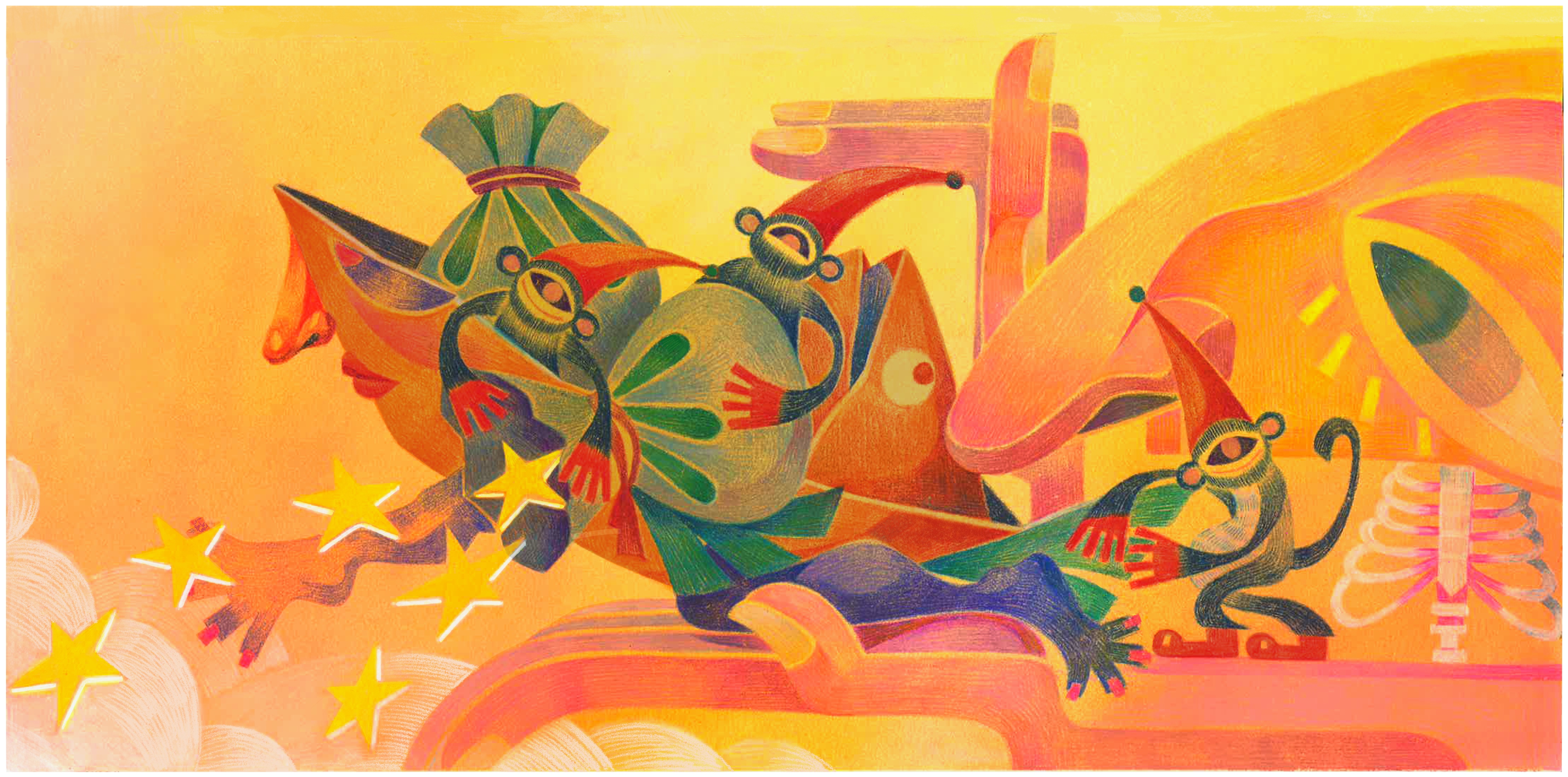 ︎ Guided by God - elves are busy preparing for the upcoming night on their strange boat—sowing stars into the sky at dusk.