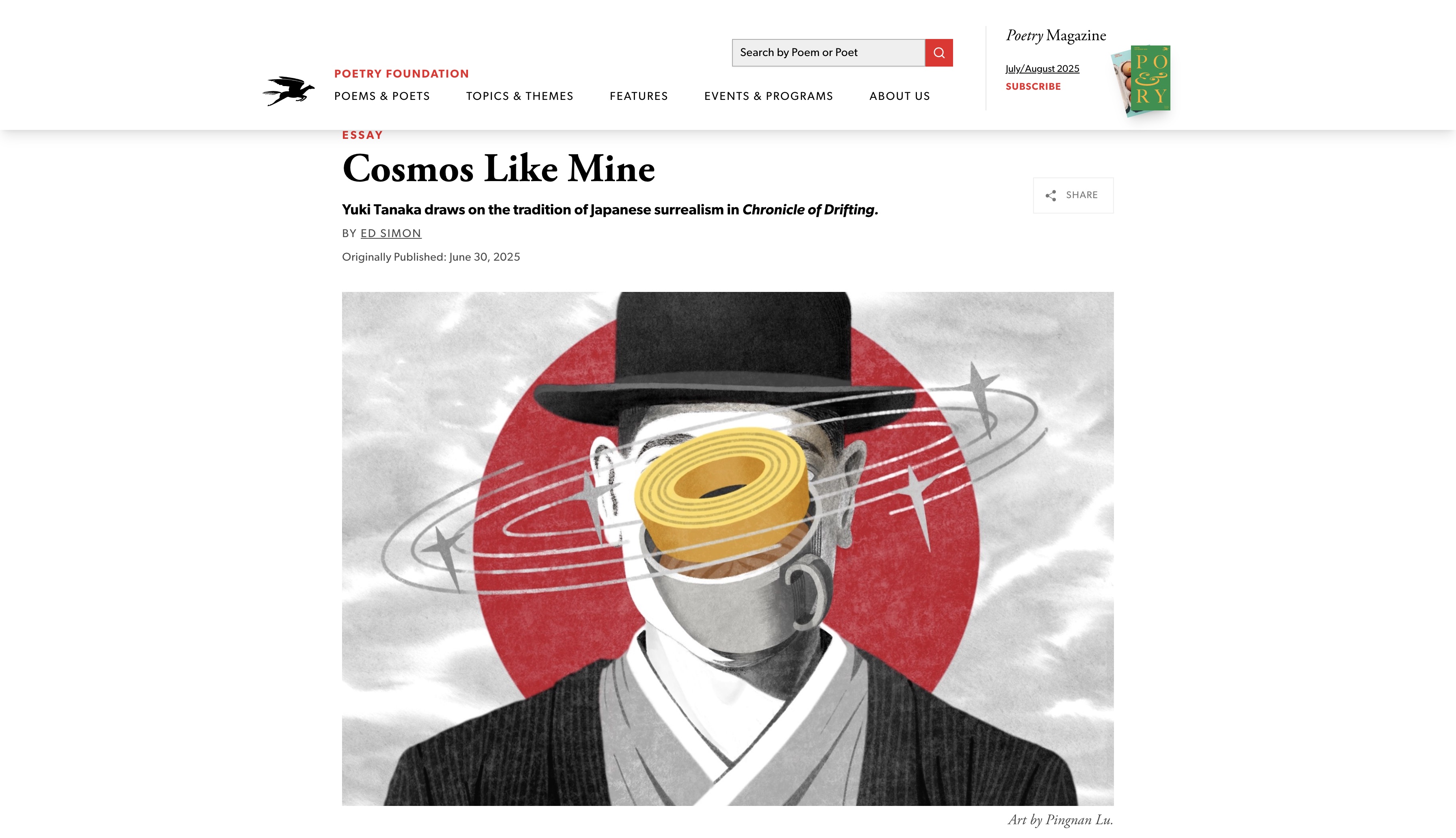 The article talks about the Japanese surrealist poet Yuki Tanaka’s debut collection, Chronicle of Drifting. The article draws comparisons between Tanaka and René Magritte, noting recurring references to Magritte’s “man in a bowler hat.” Based on the idea of “a Japanese Magritte,” I created this image. The object obscuring the figure’s face was inspired by one of Tanaka’s poems, where he imagines the rings of a cappuccino as a Baumkuchen universe.